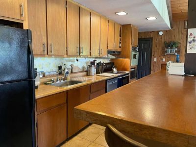 This quiet home sits on a beautiful 2-acre property. It features a full kitchen with all the necessary utensils, appliances and dishes set next to a large dining and living area.