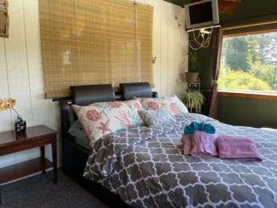 The living area with vaulted ceilings, large windows with expansive views includes a flat screen TV/DVD player, free WiFi. It features a comfortable seating to enjoy the views of the surrounding property, forest, and further views of the Inverness ridge. Two lovely bedrooms, one with a kind bed, the other one with 2 twin beds are on each side of the house, each with their brand new/renovated bathroom. A third and magical bedroom is on 180 degrees windows room, which will make you feel like you're camping in the forest (this bedroom gets cold in the winter, so if you're sensitive to low temperatures and have a group larger than 4, please be aware of this). All linens are provided.